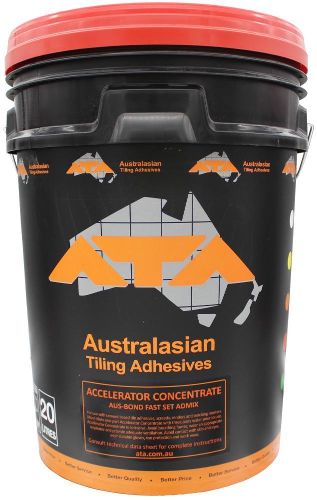 Aus-Bond Accelerator ConcentrateAus-Bond Accelerator Concentrate is a specially formulated liquid additive for use in cement-based mortars to reduce the set times. Aus-Bond Accelerator Concentrate can be mixed with sand/cement, screeds, renders, cement-based tile adhesives and grouts. Aus-Bond Accelerator Concentrate can be mixed full strength for a fast set time, or it can be diluted with clean water for a slower set time. Set times will vary depending on temperature and the type of mix it is added to. Caution: Aus-Bond Accelerator Concentrate is corrosive and care should be taken when using this product. Recommendation: Dilute 1 part of ‘Accelerator Concentrate’ to 3 parts of clean water prior to use. UsesCan be mixed with: