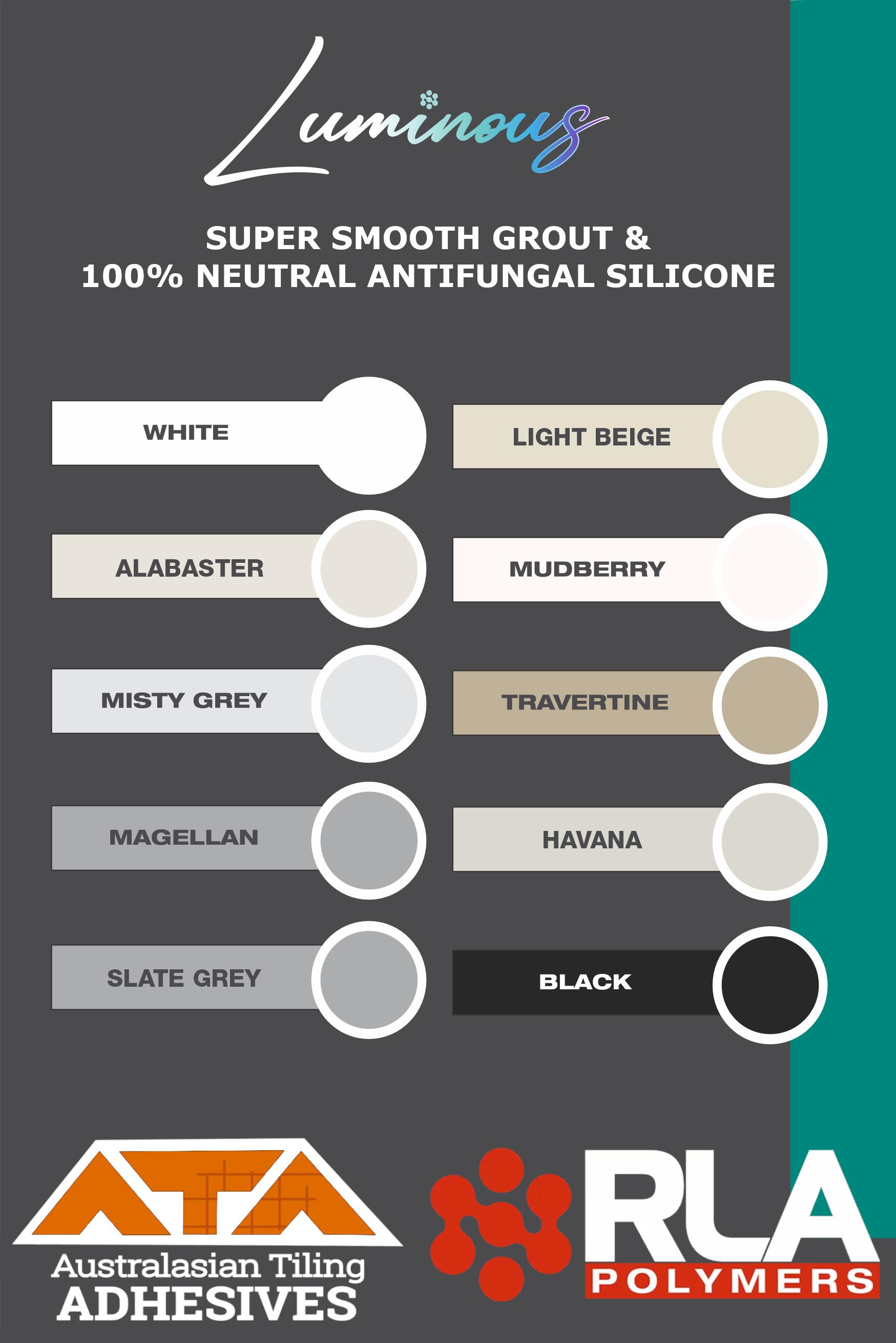 | Luminous SSG GroutRLA Luminous SSG Grout is a high performance ceramic tile grout designed for internal and external applications. With enhanced workability, the smooth finish and built-in water and mould resistance improves colour fastness, vibrancy and overall durability for demanding environments. Luminous SSG Grout is available in a range of colours to suit various design preferences. Compatible with underfloor heating systems. Available in 4kg and 10kg bags. Uses
